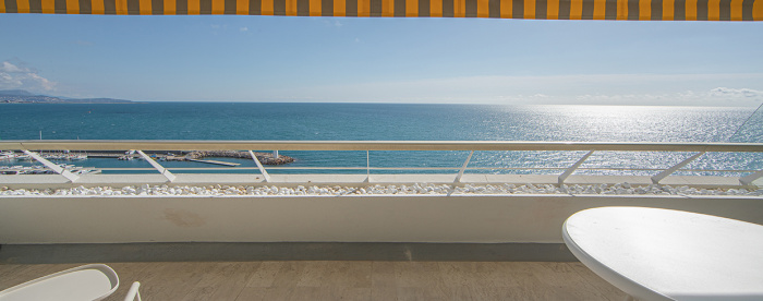 2/3 pièces 50 m² vue mer à Marina Baie des Anges en location vide : double séjour, cuisine américaine, chambre, salle de bains, WC, climatisation réversible. Disponible à partir du 10 mars 2026.